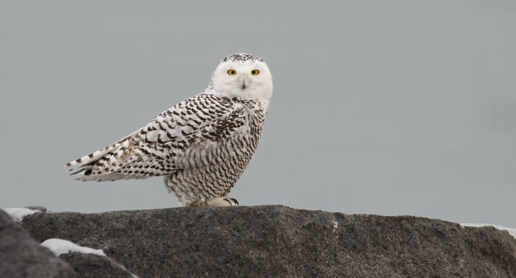 Both sexes of this owl species make a low, raspy, quick “hoo” twice in a row typically but may include up to six hoots. These songs can be heard for up to seven miles on the tundra. These owls will also do a high-pitched whistle or creaky, repeated “rah” sound when threatened.