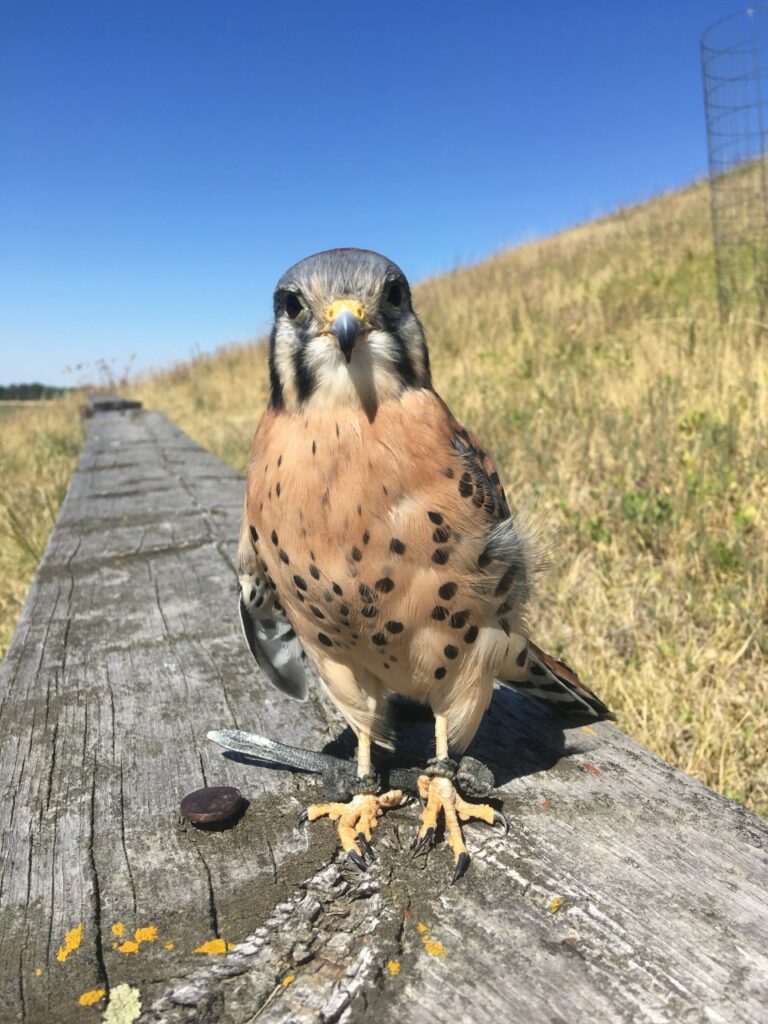 Kestrels can commonly be seen perched on telephone wires or fence posts throughout the spring and summer months in Montana. Watch for them hunting (hovering) during the day in open fields with short ground vegetation. Typically Kestrels eat insects and other invertebrates as well as small rodents and birds. Kestrels can see ultraviolet light. This enables them to make out the trails of urine that voles, a common prey mammal, leave as they run along the ground. Like neon diner signs, these bright paths may highlight the way to a meal.