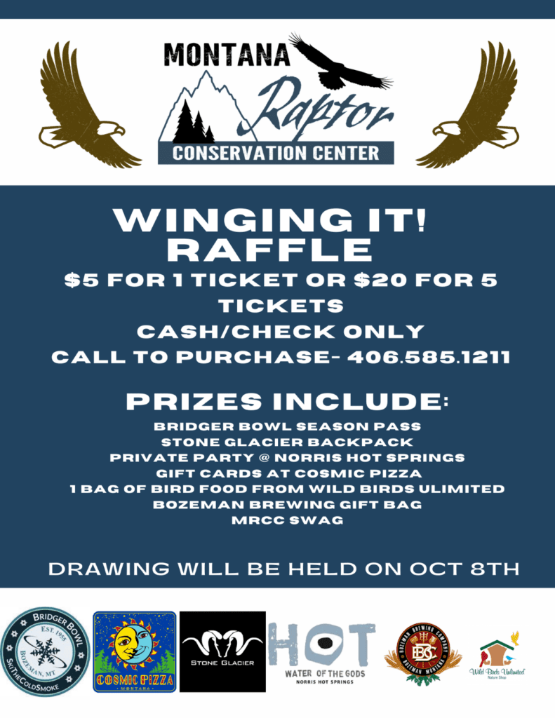 Our annual Winging it raffle is back! We have some great prizes again this year with more prizes being added. The grand prize is a Bridger Bowl adult season pass. We also have an awesome Stone Glacier hunting pack. You can purchase tickets at Raptorfest or you can call and arrange pickup. 1-406-585-1211. We would like to thank these amazing businesses, cosmic pizza, Bozeman Brewing Company, Wild Birds Unlimited, and Norris Hot Springs.